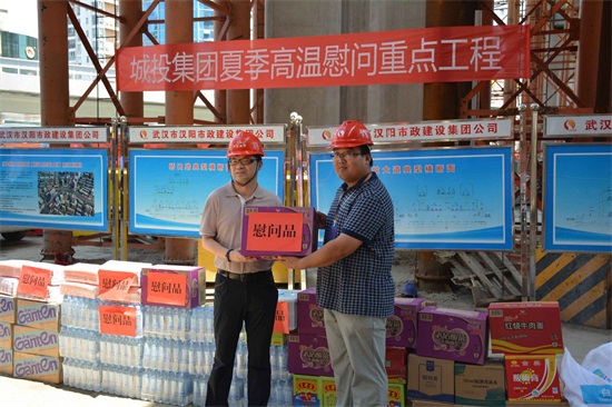 2018年入夏以来,武汉遭遇了持续的高温天气,局部气温攀升到了37摄氏度以上。作为武汉市城建重点项目之一,宝硚项目的建设工作在高温环境下也没有丝毫松懈,施工现场仍然是一幅撸袖大干的景象。6月27日上午,武汉市城投集团总经理助理李卫、桥建集团董事长朱明刚一行来到汉阳市政集团宝硚项目施工现场,为奋战在施工一线的工人们送去饮用水、绿豆、白糖、防暑药物等慰问物资。